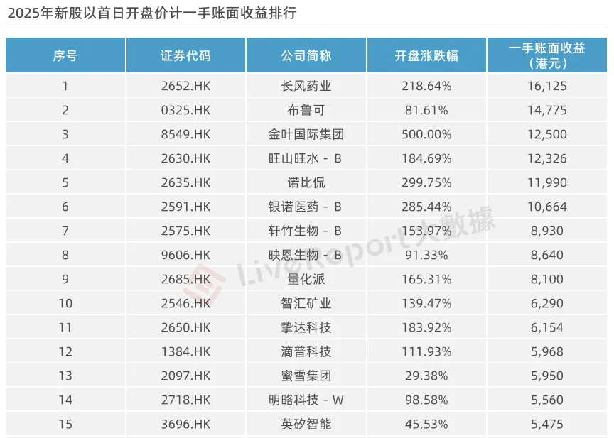 以上市首日开盘价计,在未计手续费的情况下,假设每只新股中一手,投资者全年所有新股的一手账面收益达到22.33万港元。一手账面收益超过5000港元的新股有17只,其中排名前六的公司分别为长风药业、布鲁可、金叶国际集团、旺山旺水-B、诺比侃 、银诺医药-B,一手收益均超万元。