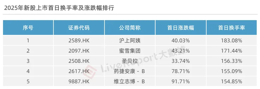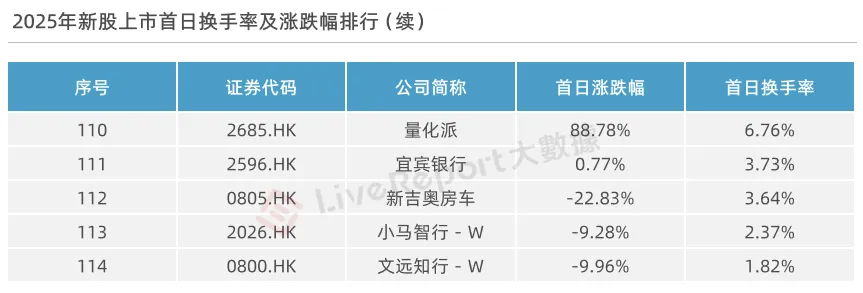 换手率方面,2025年按上市首日实际可流通港股股本计,114家新股的上市首日换手率平均值约为58.01%。