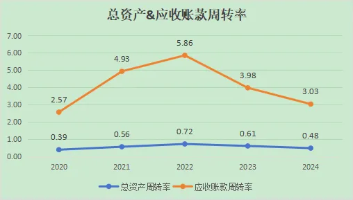 两项指标都是明显的先升后降的趋势,按照近五年的每年期末应收余额来看,应收账款周转率应该是“因”,总资产周转率是“果”。可能是前期应收账款的账龄不断增加导致收回难度增加?