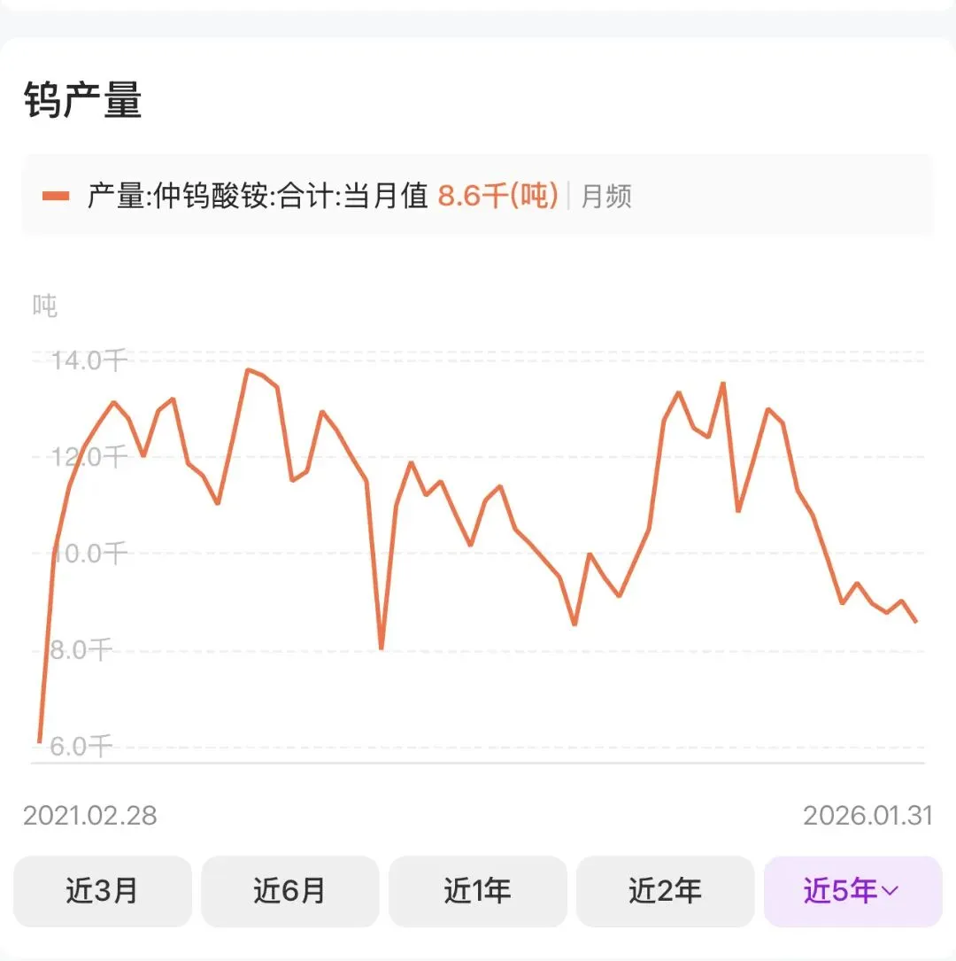 2025年5月后大涨核心:2025年1-9月钨精矿产量同比减3650吨,APT消费同比增8850吨,供需缺口直接扩大1.25万吨,进口+废钨补充后仍存在硬缺口;