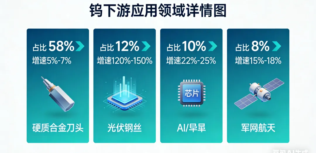 钨消费核心结构:硬质合金占钨总消费64.22%,其中刀具消费占比达42.84%,为钨第一大消费领域,传统刀具+新兴制造需求同步高增。