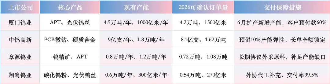 我们依托上市公司公告产能、订单核验数据,从订单交付能力、业绩锁定能力两大核心维度,验证钨板块龙头企业2026年业绩的硬核支撑。
