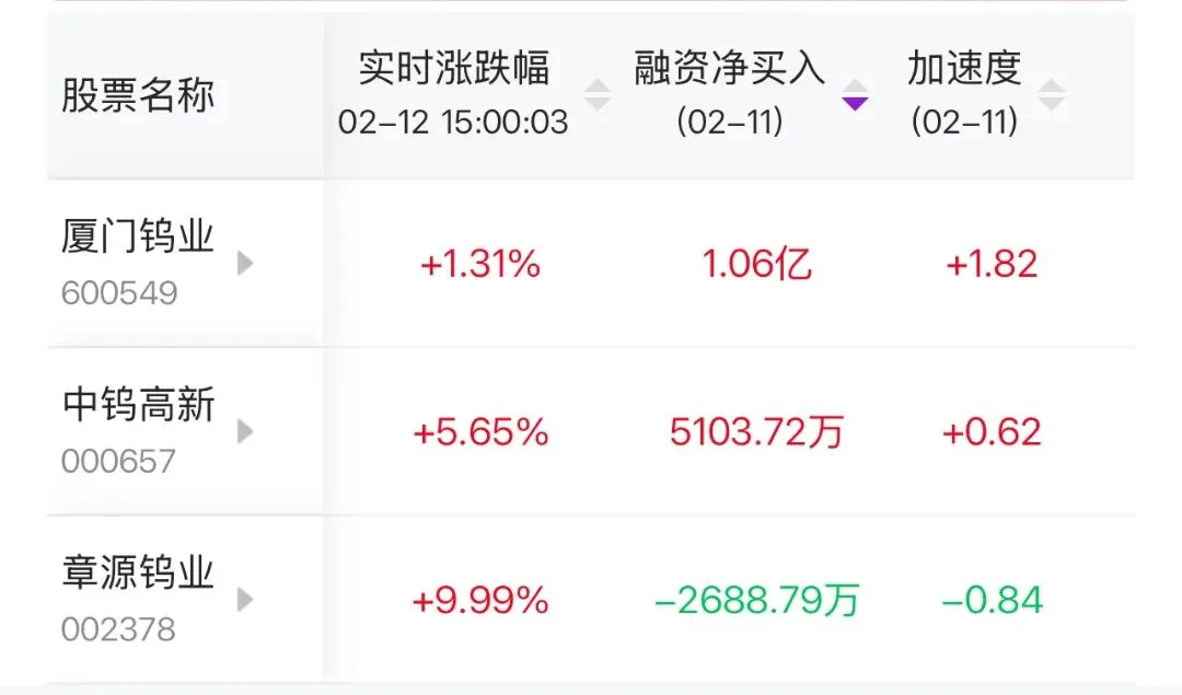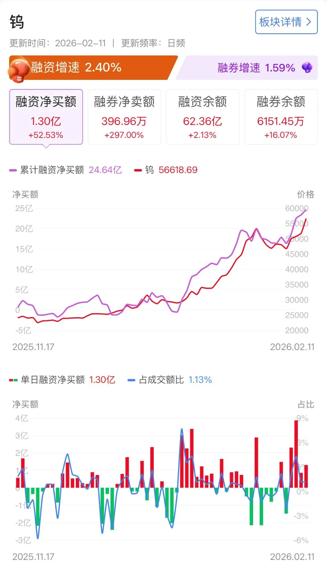 虽全市场两融杠杆率近期有所降低,但影响股价弹性的两融资金依然连续四个交易日持续买入钨金属板块,截至2.11日,单日融资增速达2.4%,融资净买入金额达到1.3亿元,增速和金额都属于市场较高水平。