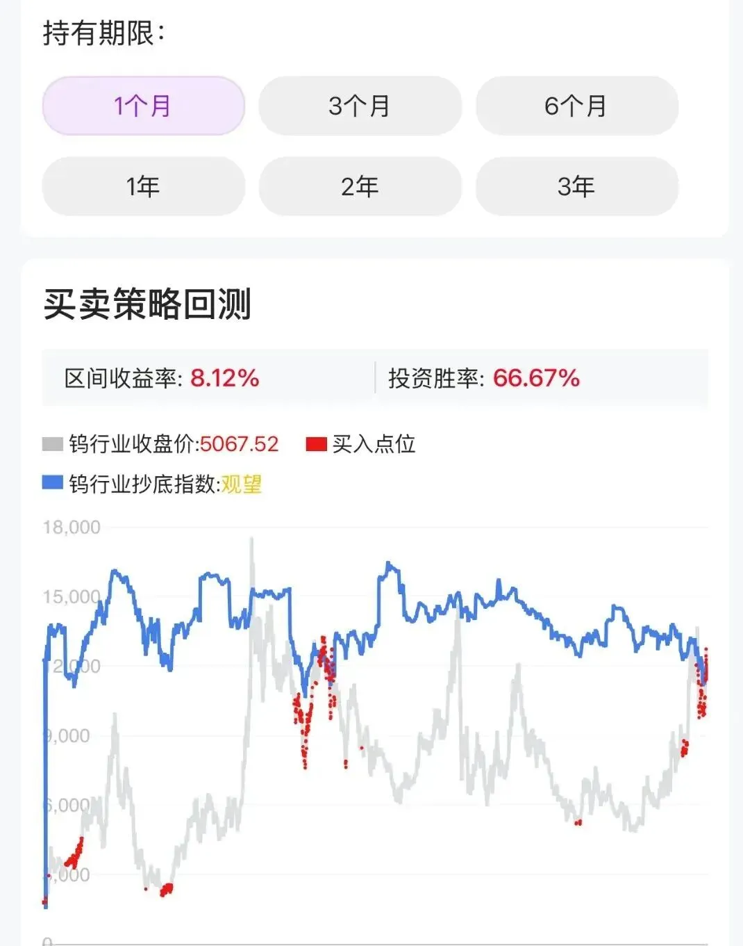 若根据过去二十年钨板块行情数据进行量化回测,持有板块1个月时间,平均可获得回测区间收益率8%左右,属于中等水平。