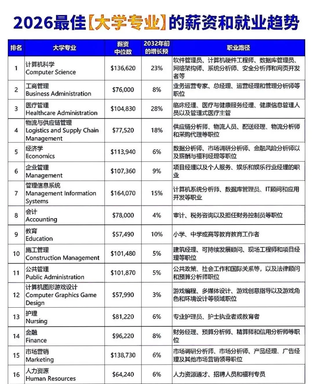 ✅学历贬值风险:传统文科(哲学、历史)、会计学、工商管理、新闻传播学等专业,硕士起薪可能低于有经验的本科生,建议辅修数据分析、AI工具等技能。
