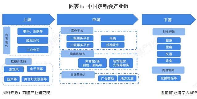 演唱会产业链涉及领域较多,呈现出较为完整的分工协作模式。上游涵盖内容制作与软硬件支持,内容制作涉及歌手、乐队、经纪公司以及主办公司;软硬件支持则包括麦克风、电子屏幕、扬声器、舞台灯光设备等。中游主要由票务平台、演出场馆方与品牌赞助方构成,票务平台有面向社会大众的一级票务平台和二级票务平台,还存在内购以及机构黄牛等现象;演出场馆方负责体育馆/场、剧院、剧场等的运营及安保服务;品牌赞助方则通过广告赞助、与地方文旅合作等方式参与其中。下游包含城市衍生经济以及产业周边售卖两方面,衍生经济涉及旅游、住宿、交通、饮食,应援物品与周边售卖则进一步拓展了产业链的盈利渠道,整体形成了从内容创作、技术支持到票务售卖、现场演出,再到后续衍生价值挖掘的环环相扣的产业体系。