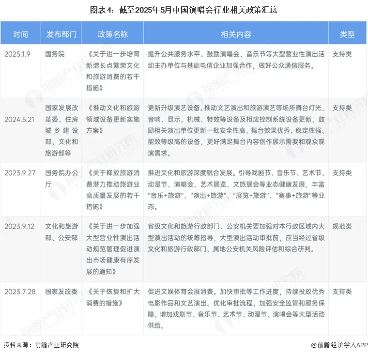 我国演唱会行业相关法律规划及政策规划主要体现在支持产业发展、规范市场秩序和推动数字化转型等方面。具体政策如鼓励演唱会与电信企业合作提升通信服务、推动5G与文化娱乐产业融合、更新升级演艺设备等,促进演唱会行业的基础设施建设和技术创新;同时,规范类政策着重于加强演出活动的审批和现场监管,保障演出市场的健康有序发展;此外,还有推动产业融合与数字化发展的规划,旨在构建线上线下融合的演艺产业格局,引领全球演艺产业发展变革方向: