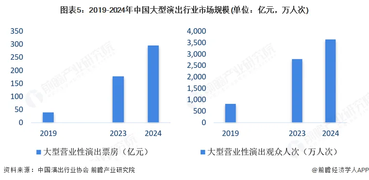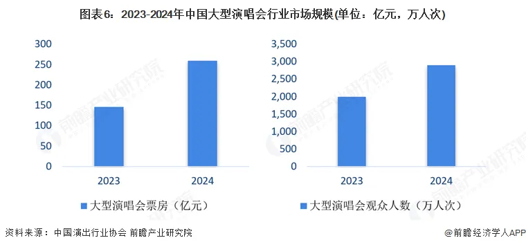其中,2024年国内大型演唱会票房突破260亿,同比增长78.1%,下半年进入开演热潮;观众人数超过2900万人次,同比增长45.0%,成为演出市场票房成绩最为突出的品类。