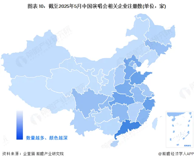 从产业基础上看,通过企查猫检索国标行业“文艺创作与表演(R8810)、艺术表演场馆(R8820)、文化活动服务(R9051)、文化娱乐经纪人(R9053)、其他文化艺术经纪代理(R9059)”、登记状态为“存续/在业”的企业,截至2025年5月30日,中国相关企业有48.45万家,从演唱会产业链代表性企业的区域分布情况来看,广东省内企业数量最多,超5万家;其次是浙江、山东、湖北及河北省,省内演唱会业企业数量分别为3.61、3.52、3.43和3.08万家,排名全国第二至五位,前五省合计占比全国演唱会企业数量的38.3%。