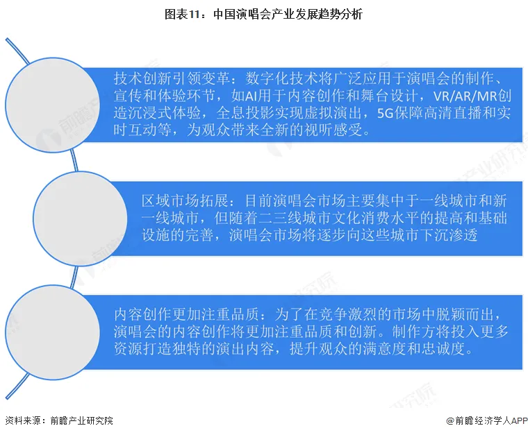 中国演唱会行业前景广阔,在政策支持、消费需求增长、技术创新和产业链融合发展的推动下,市场将持续扩大。未来,数字化技术将深度融入演唱会的各个环节,线上线下融合加速,新兴细分市场不断涌现。区域市场将向二三线城市拓展,跨城观演成为常态。同时,内容创作将更加注重品质,行业整合与规范发展也将成为趋势。