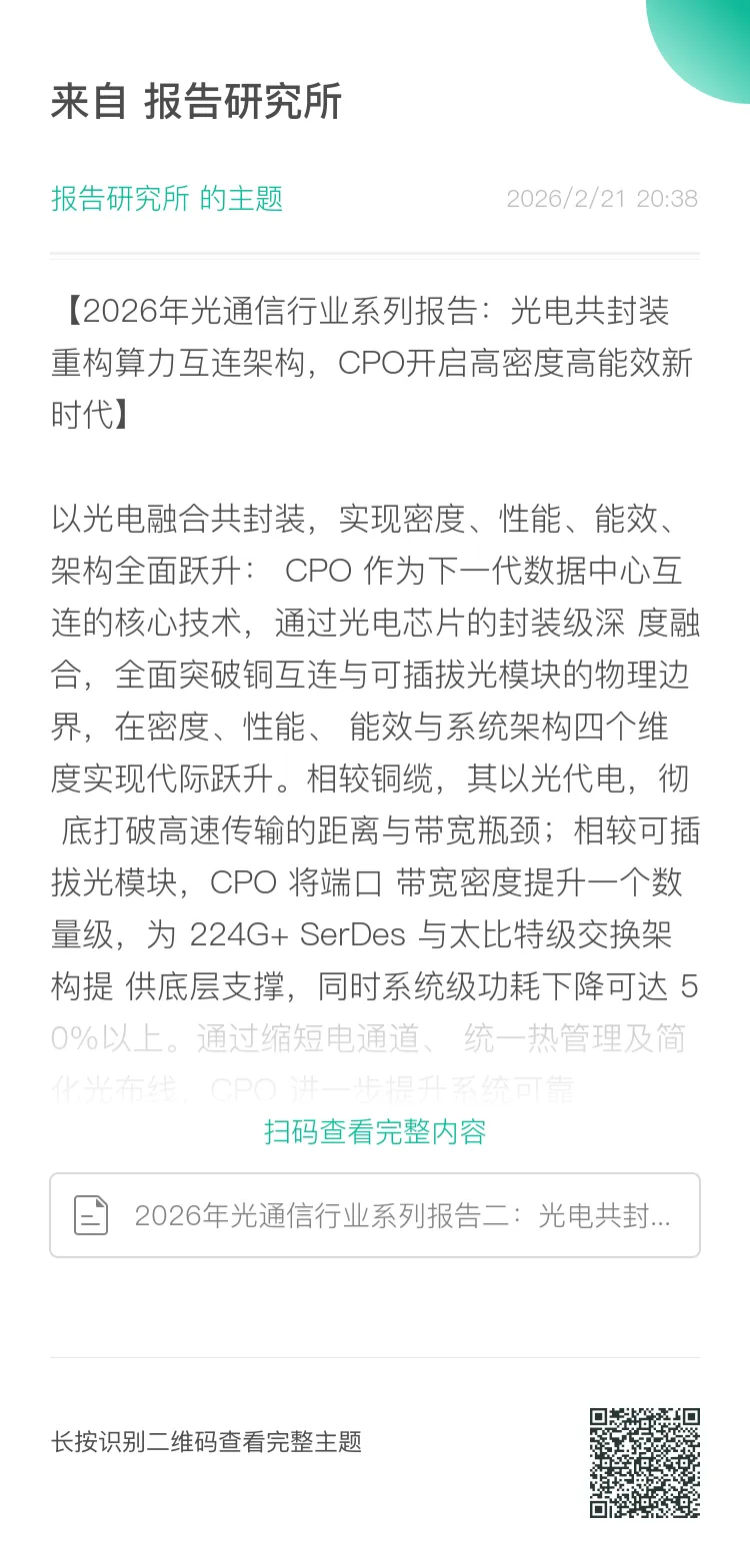 共封装光学 CPO(Co-Packaged Optics) 是一种将光引擎与交换 ASIC 芯片通过高密度互连 集成于同一封装载体内的先进架构。该技术通过将光引擎紧邻 ASIC 封装,显著缩短高速电 接口(如 SerDes)的传输距离,实现芯片间(D2D)及设备间(M2M)的短距光互连。CPO 方 案省去了传统架构中复杂的射频走线及 Redriver/Retimer 等中继器件,从而显著降低功耗 与系统成本,实现更高的集成度与带宽密度。在该架构下,光引擎取代传统光模块,成为光 电转换的核心单元,被视为下一代低功耗、高集成度封装技术的主要发展方向。 CPO 正成为突破算力扩展瓶颈的关键技术,其价值将在 Scale-Up 与 Scale-Out 两大路径中 充分体现。在 Scale-Up 层面,CPO 旨在解决节点内 GPU 互联的物理限制。传统铜缆在 200Gbps/lane 及以上速率时,传输距离最多只有两米且功耗高。CPO 通过光电深度融合,将 能效提升至接近大规模商用临界点(当前 Nvidia 方案已达 5.6pJ/bit,逼近铜缆 5pJ/bit 替 代阈值),从而打破机箱边界,实现跨机柜的低延迟统一内存访问,为构建超大规模计算单体 铺平道路。在 Scale-Out 层面,CPO 通过光引擎与交换 ASIC 的共封装,将助力突破 51.2T+ 交换机的带宽与能效瓶颈。它大幅提升了叶脊网络的互联密度,有效支撑 AI Fabric 的大规 模节点间通信,是实现分布式集群高效横向扩展的核心引擎。