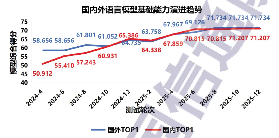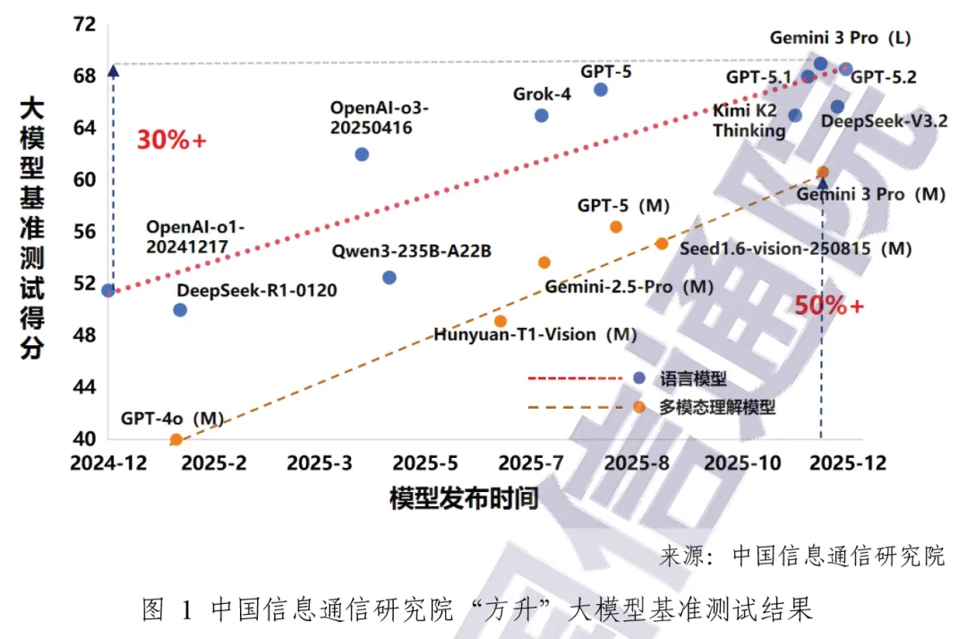 2025 年全球人工智能领域迎来基础模型关键突破期,语言基础模型与推理模型双线并进,从中国信通院 “方升” 测试数据来看,截至 2025 年 12 月,以 GPT-5.2、Gemini3 Pro、DeepSeek V3.2、Qwen3、Doubao-Seed-1.6 等为代表的头部语言大模型,综合能力较 2024 年底提升 30%,多模态理解能力提升超过 50%,实现基础能力跨越式提升。
