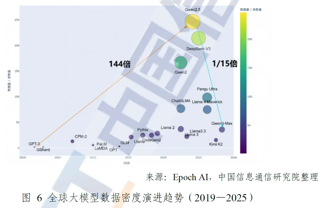 但数据密度指标出现见顶回落迹象,2024 年后部分模型的参数扩张速度已超过训练语料增长速度,行业不再单纯依靠提升数据密度实现性能突破,未来将更多依赖高质量数据筛选、训练架构优化及跨模态知识融合。