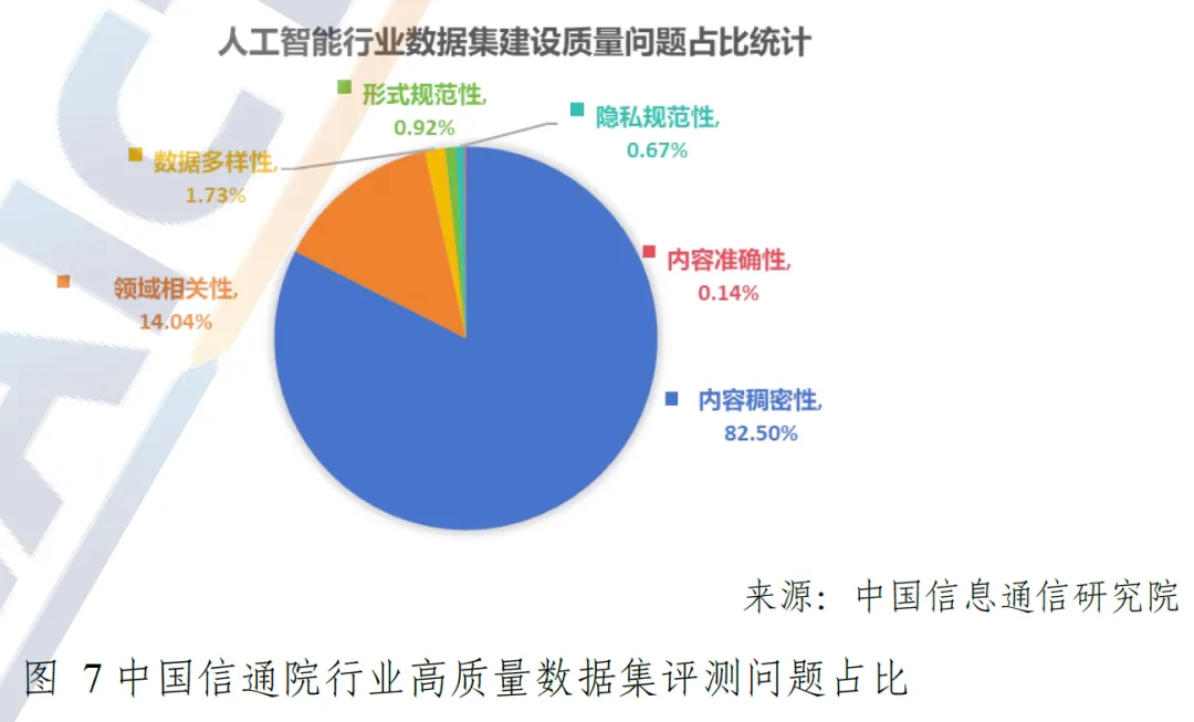 从行业发展问题来看,数据集质量成为制约垂类模型落地和场景应用的核心瓶颈。根据中国信通院 ADAQ 体系评估结果,当前行业数据集建设的核心质量问题中,内容稠密性问题占比达 82.50%,主要表现为数据集信息细节、句子成分及关联关系缺失、内容重复;其次为领域相关性、数据多样性、形式规范性等问题,隐私规范性问题占比最低。