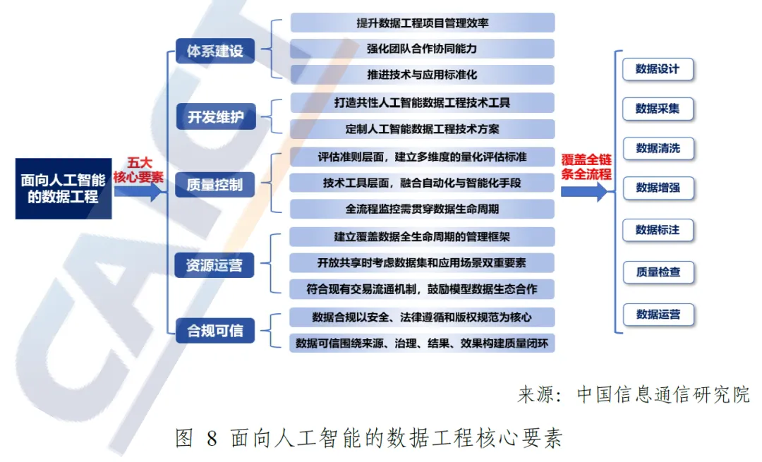 从工程支撑来看,面向人工智能全生命周期的数据工程体系建设全面提速。面向人工智能的数据工程由体系建设、开发维护、质量控制、资源运营、合规可信五大核心要素组成,覆盖数据设计、采集、清洗、增强、标注、质检、运营的全链条,为高质量数据生产提供了全流程体系化支撑,保障人工智能产业可持续发展。