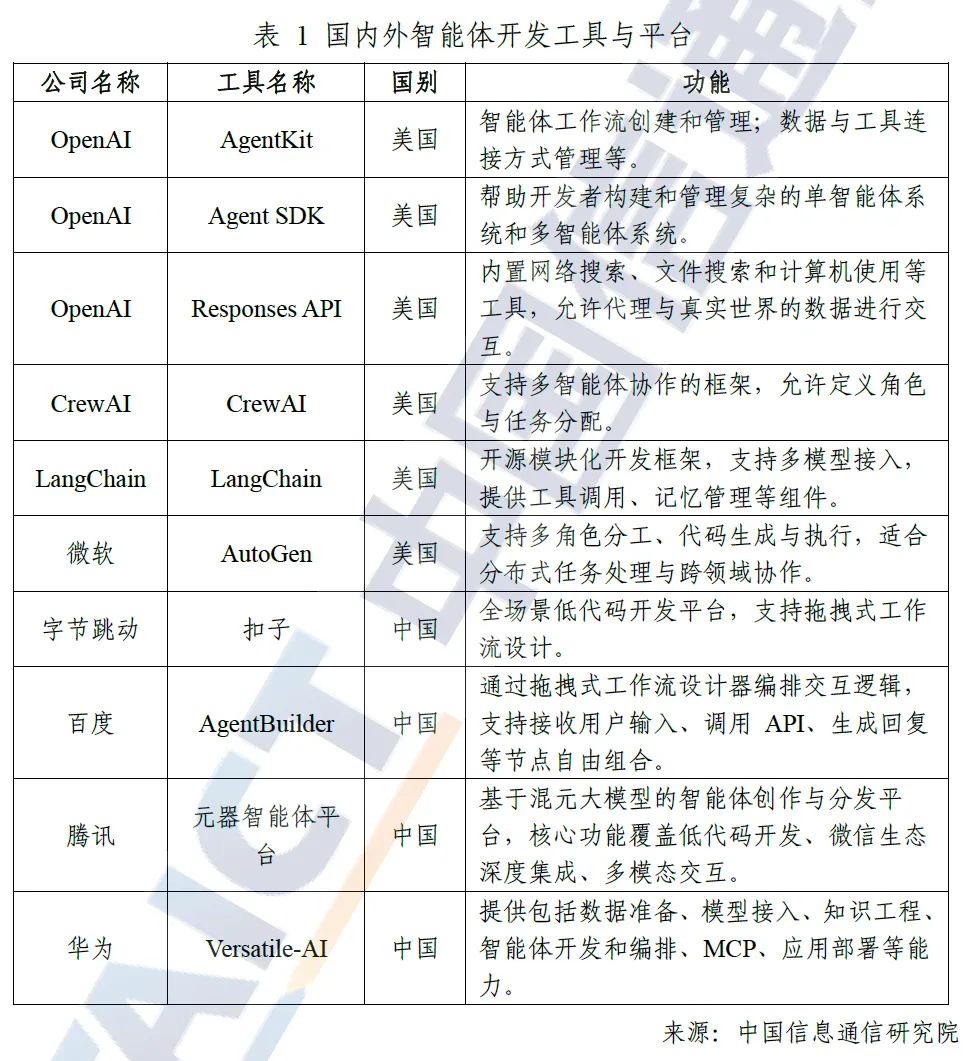 智能体开发工具逐步完善,大幅降低开发者研发门槛。2025 年 OpenAI 发布智能体工具集 AgentKit,解决了传统智能体开发中工具碎片化、编排复杂等核心问题;我国字节跳动扣子、百度 AgentBuilder、腾讯元器智能体平台等产品,均支持通过低代码 / 无代码方式完成智能体创建,不仅加速了智能体系统的开发落地,也推动了智能体生态的规模化建设。