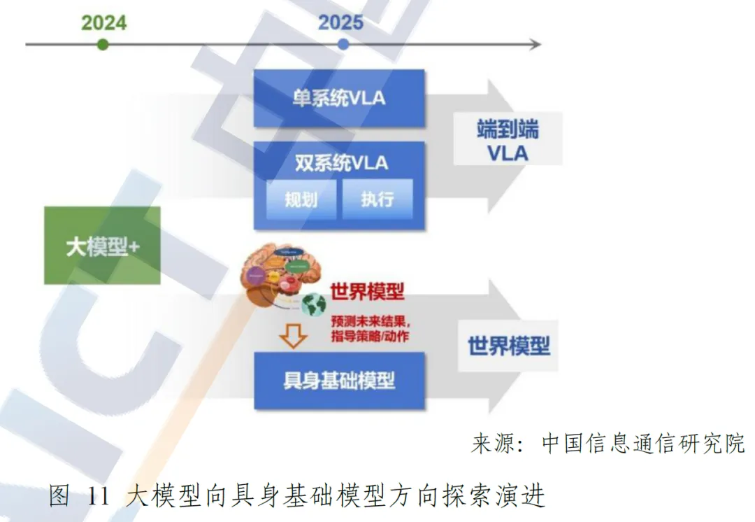 具身基础模型实现多路径技术突破,“大脑” 能力和 “大小脑协同” 成为核心创新方向。一是端到端 VLA 架构加速探索,分为单系统架构与双系统架构两类,前者在统一模型内完成感知、决策和动作生成,后者实现认知推理与本体运控的协同优化,均已在家庭场景、工业作业场景实现落地验证;二是世界模型拓展具身智能基础模型的认知边界,通过生成未来视觉观察结果、模拟感知决策过程,大幅提升模型在未见环境中的泛化性,为具身智能决策规划提供核心支撑。