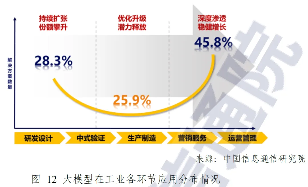 从赋能环节看,大模型成为工业全环节赋能的重要支撑,呈现 “两端深化、中间突破” 的发展态势。前端研发设计环节应用占比小幅下降,但赋能专业程度有所提升,从 “通用技术探索” 转向 “精准场景赋能”,针对化工、医药等行业研发周期长的痛点,实现研发效率超 10 倍的提升;生产制造环节应用占比从 18.8% 提升至 25.9%,工业质检、工艺参数优化等场景广泛落地,成为助推生产效率提升的新引擎;后端运营管理环节占比最高达 45.8%,且呈现小幅上升趋势,大模型已从辅助数据分析升级为智能决策支持,推动企业调度从辅助决策向自主决策转型升级。除此之外,工业领域大模型应用呈现明显的平台化与集成化发展趋势,形成 “底座 + 应用” 的分层赋能架构,既保障了基础能力的通用性,又确保了专业场景的适配深度。