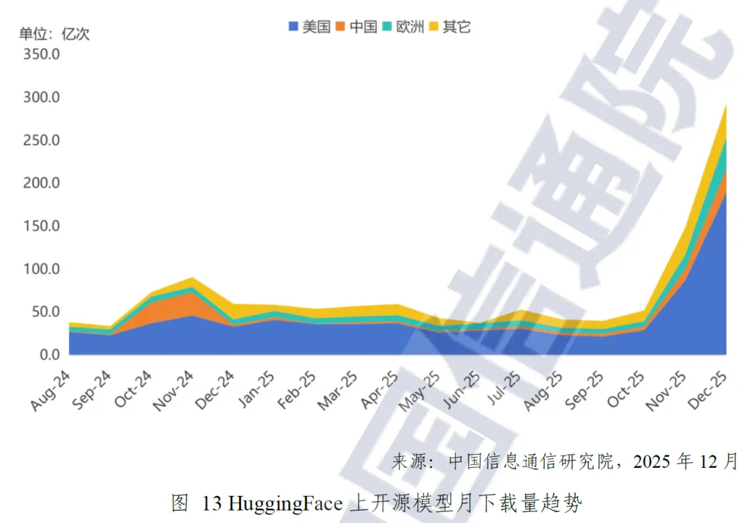 国产开源模型创新活跃,国际影响力稳步提升。以深度求索、通义千问等为代表的国产开源模型迅速崛起,性能稳居全球前列,打破了闭源模型的垄断格局。截至 2025 年 12 月,国产开源大模型全球累计下载量突破 100 亿次,月下载份额最高占全球的 17.1%;本土开源社区模型下载量从 2024 年 12 月的 5.8 亿次,增长至 2025 年 11 月的 14.4 亿次;基于国产开源模型进行微调的模型占比,从 2024 年 2 月的 10% 大幅提升至 2025 年 8 月的 60%,充分印证了国产开源模型在全球范围内的接受度和影响力正快速增强。