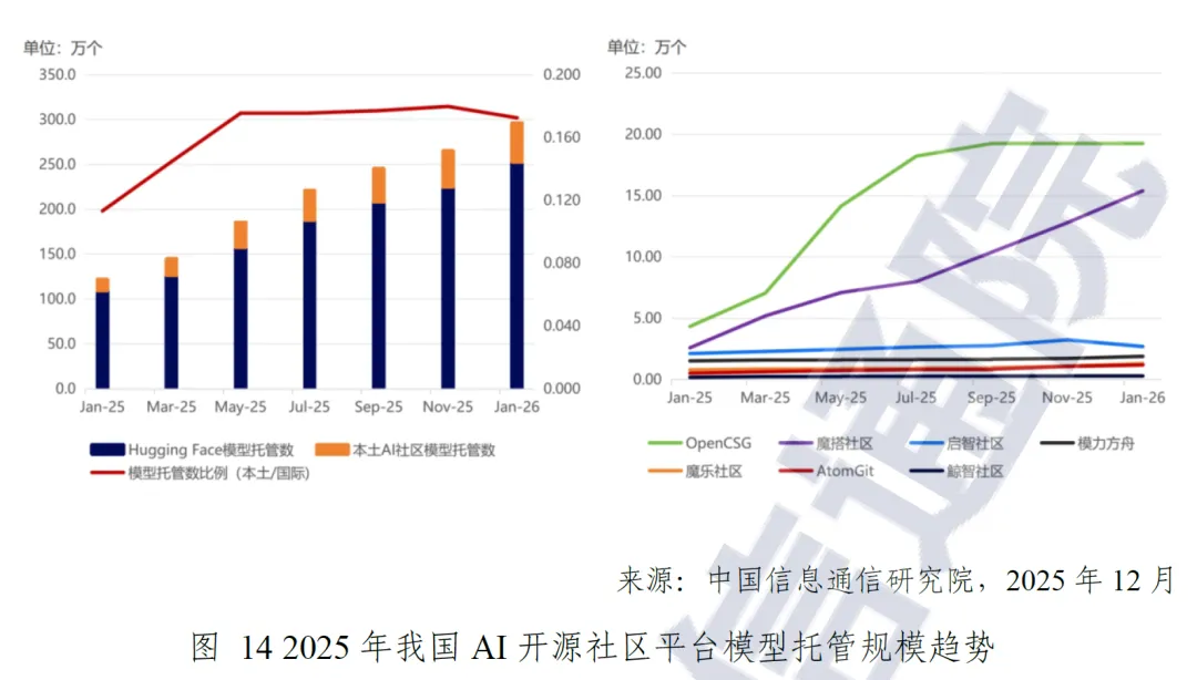 本土开源社区协同演进,推动技术普惠发展。魔搭社区面向东南亚提供本地化支持,助力国产开源模型走向国际;焕新社区聚焦 “人工智能 + 行业应用”,开放 78 个央国企发布的行业大模型;魔乐社区围绕国产软硬件全栈适配,实现上千个模型对国产算力的兼容适配。截至 2025 年 12 月,本土开源社区平台已托管模型达 40.5 万个,与国际平台 HuggingFace 同期托管模型的比例从年初的 11% 提升至 18%,本土开源生态稳步壮大。