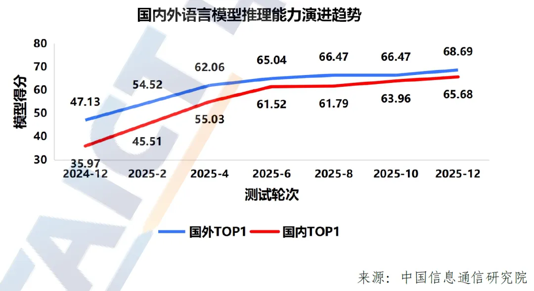 基准测试成为产业发展的核心支撑,国内外模型能力差距清晰显现。依托长期、动态化的大模型基准测试,可精准量化模型能力演进趋势,从测试结果来看,国内头部语言大模型在基础能力上与国外头部模型不相上下,但在推理能力上差距明显,成为两者综合能力差距的主要影响因素。