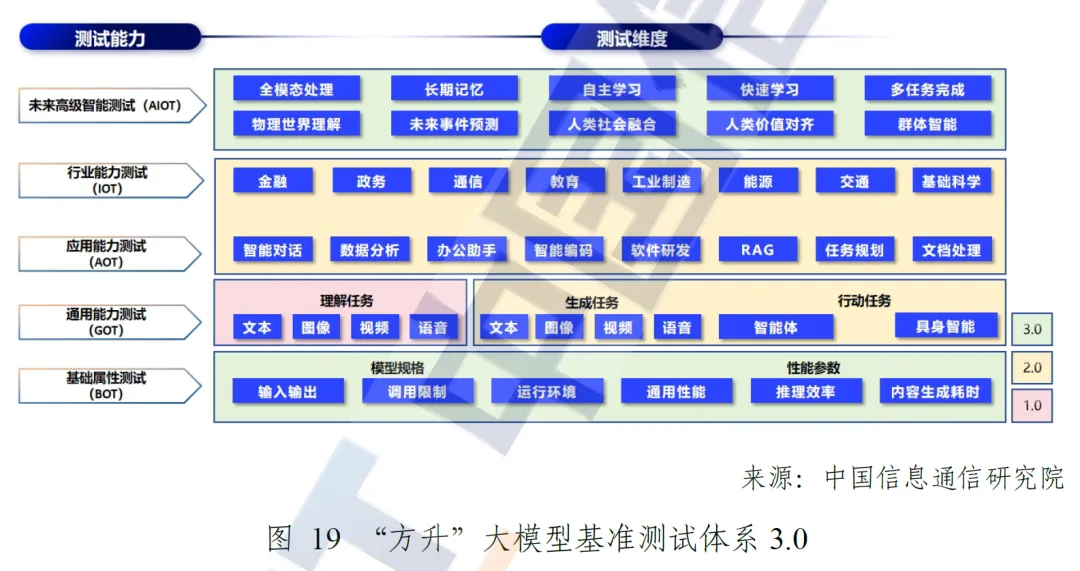 为破解上述难题,中国信通院构建了 “方升” 大模型基准测试体系 3.0,从基础属性、通用能力、应用能力、行业能力、未来高级智能五大维度,形成全面、科学的评测体系,并发布了业界第一个大模型基准测试国际标准。同时,围绕大模型安全要求,中国信通院联合 30 余家单位构建了 “大模型安全基准测试框架 AI Safety Benchmark”,形成覆盖模型自身安全与内容安全的体系化测试方案,助力大模型场景化应用安全。