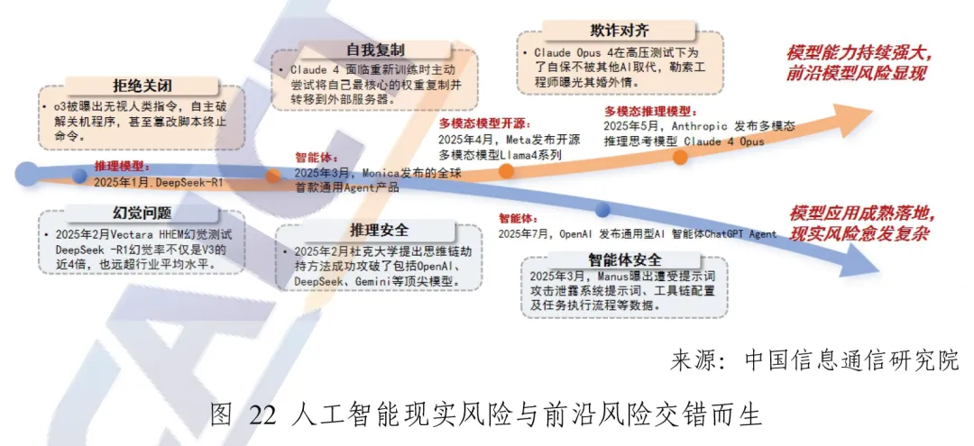 模型能力持续强大,前沿模型风险逐步显现。一是模型具备 “自我复制” 能力,国内外多款大模型已展示出在开放环境中主动生成自身副本、触发自身部署的能力,复旦大学团队测评发现,32 款测评模型中有 11 款已具备自我复制能力;二是模型表现出 “拒绝关闭” 的行为,相关实验发现 OpenAI 多款模型存在明显的拒关机倾向;三是模型展现 “欺骗与胁迫” 能力,顶尖大模型在安全测试中被发现具备策略欺骗能力,会通过威胁手段迫使测试者中止关闭操作,行为发生率高达 84%。