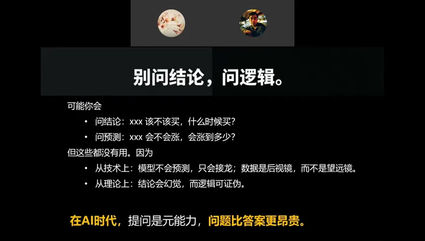 AI本质上是芒格的外化,是一个永远有时间、永不嫌烦但可能迎合使用者的存在,其答案并非绝对正确,使用者需具备判断能力与解读能力。因此,需将通过AI“找答案”的思维,转变为用AI找视角、找盲区、找逻辑,这是AI赋能投资的核心前提。