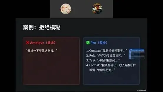 以财报分析为例,低质量问法为“请帮我分析英伟达最近一季度的财报”,而专业的问法需明确自身定位、AI角色、任务要求,还可通过指定操作降低幻觉、固定输出格式,如“我是一位正在学习价值投资的投资者,请你以专业财报分析师的视角,先找到英伟达最近的财报并仔细阅读,再分析其财报亮点,按维度|关键结论|支持依据|是否发生变化的表格格式输出”。