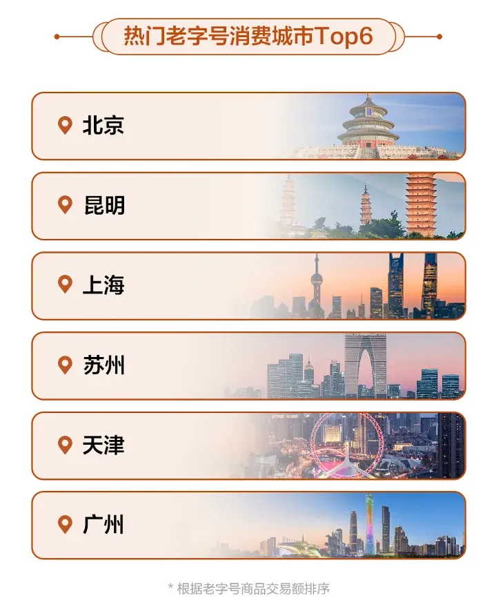 同样引人注目的是老字号消费的城市格局,北京、昆明、上海、苏州、天津、广州位列老字号消费最旺盛的城市Top6。一线城市和特色城市交相辉映,既有北京、上海这样老字号云集、历史悠久的国际都市,也有昆明、苏州这类地域文化特色浓郁的城市。