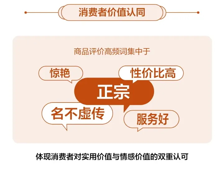 在口碑方面,消费者对老字号的评价聚焦于产品和服务的高品质。平台上的老字号商品评价高频词包括“惊艳”、“性价比高”、“正宗”、“名不虚传”、“服务好”等。这些关键词一方面反映出老字号产品本身过硬的品质和令人惊喜的体验,另一方面也说明消费者对老字号所承载的情感价值给予了高度认可,“正宗”、“名不虚传”体现出人们对老字号悠久声誉的信任,“性价比高”、“服务好”则表明老字号在与时俱进提升顾客体验。