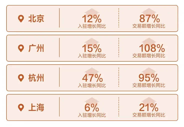 这一差异反映出各地老字号数字化发展所处的阶段不同,有的城市注重深耕存量,如广州一边保持稳定的入驻增量,一边实现了最高交易增长,有的则积极扩容增量,如杭州大量新增老字号入驻,而上海等成熟市场则趋于稳定发展。