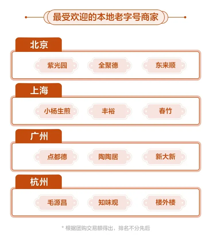 从消费数据来看,一批头部老字号商家成为用户在抖音平台上的热门选择。抖音发布了2025年“最受欢迎的老字号商家”,西安的同盛祥、广州的泮溪酒家和陶陶居、昆明的冠生园、上海的上海大酒店、长春的鼎丰真六大老字号入围,在抖音平台上团购交易额名列前茅。这些百年老店凭借各自的特色产品服务,在抖音上吸引了大批新老顾客,以销量印证了其经久不衰的魅力。