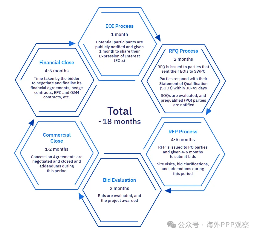 1. SWPC采购采用PPP模式,通过竞争性招标选择私营部门合作伙伴,提供主权担保和长期购水协议(25年),要求本地化率超80%,并遵循透明的EOI-RFQ-RFP-Financial Close流程,典型采购周期约18个月。