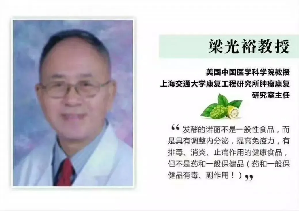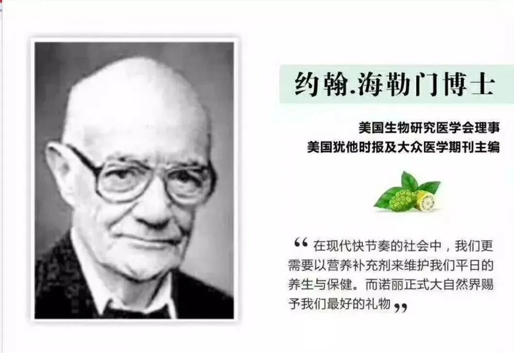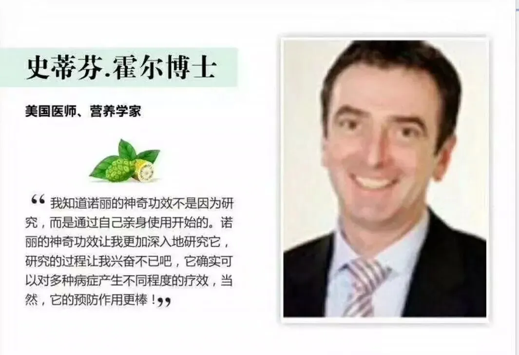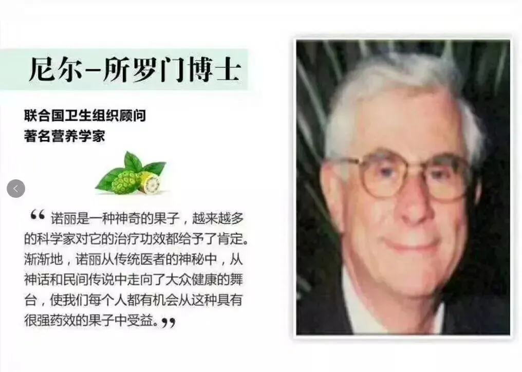 · 尼尔·所罗门博士(联合国世界卫生组织顾问、医学博士):他曾在美国国立卫生研究所及约翰·霍普金斯医学院主持研究,强调诺丽在预防医学中的巨大潜力。