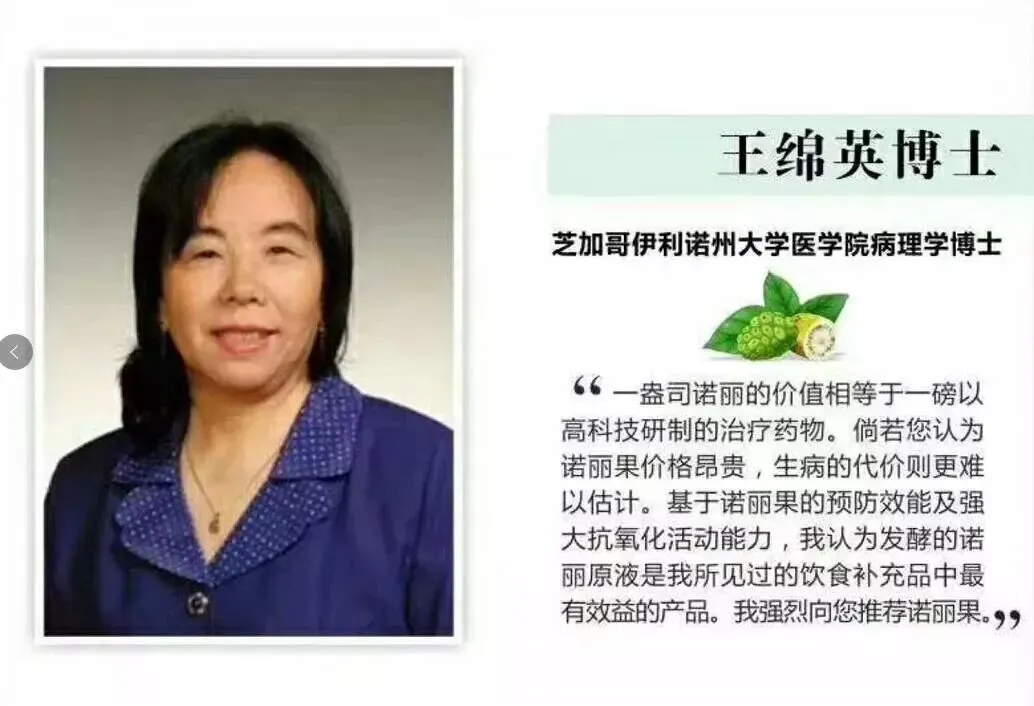· 王绵英博士(芝加哥伊利诺伊州大学医学院病理学博士):她专注于研究诺丽如何在分子层面预防癌症。她有一个著名的论断:“一盎司诺丽果汁的价值,相当于一磅以高科技研制的治疗药物。倘若您觉得诺丽果价格昂贵,那么生病的代价则更难以估计。”