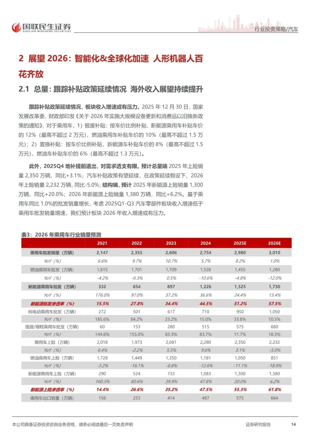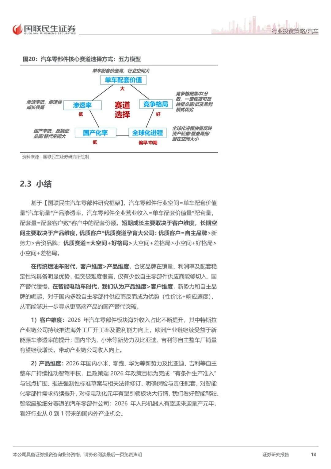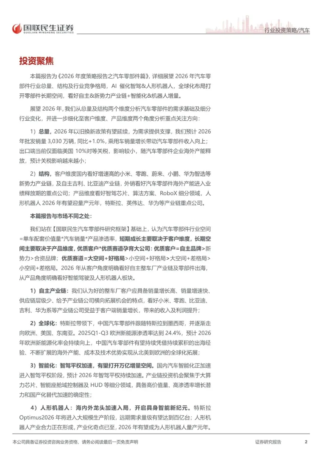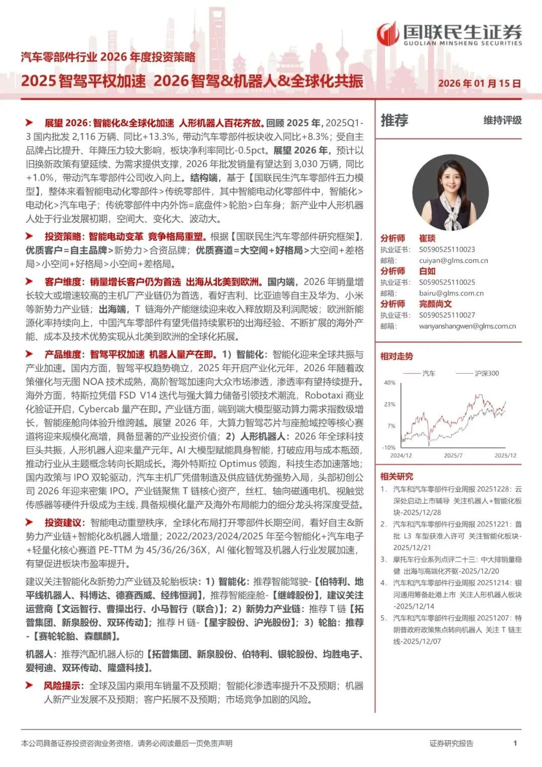 本篇报告为《2026年度策略报告之汽车零部件篇》,详细展望2026年汽车零部件行业总量、结构及行业竞争格局,AI催化智驾&人形机器人,全球化布局打开零部件长期空间,看好自主&新势力产业链+智能化&机器人增量。