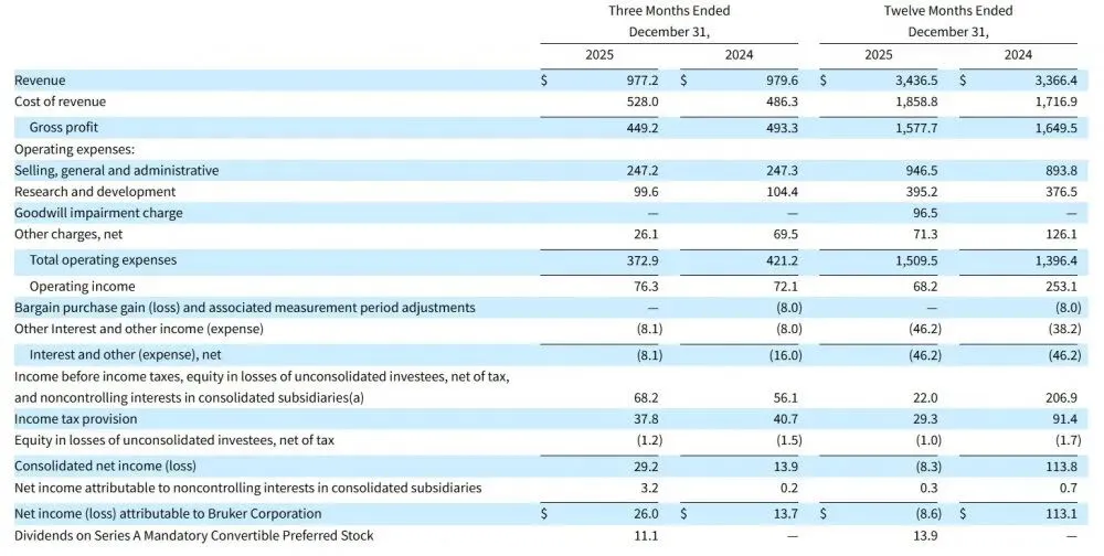 Bruker CALID: 2025年第四季度的收入为3.316亿美元,同比增长3.4%,年收入为12.102亿美元,同比增长10.7%。