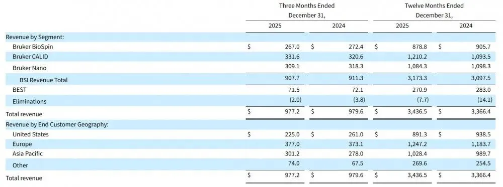 Bruker BioSpin: 2025年第四季度的收入为2.67亿美元,同比下降2.0%,年收入为8.788亿美元,同比下降3.0%。
