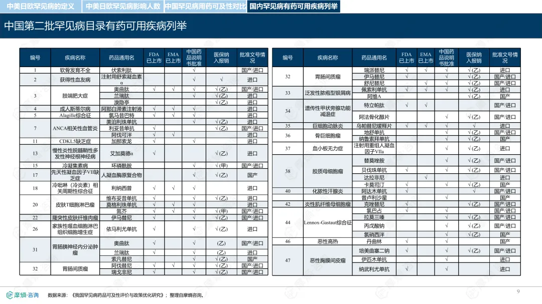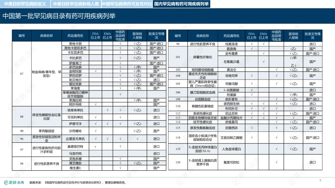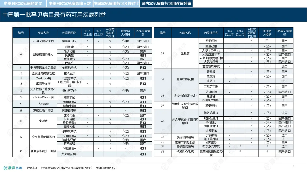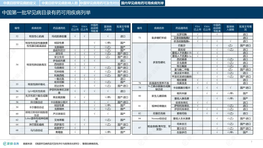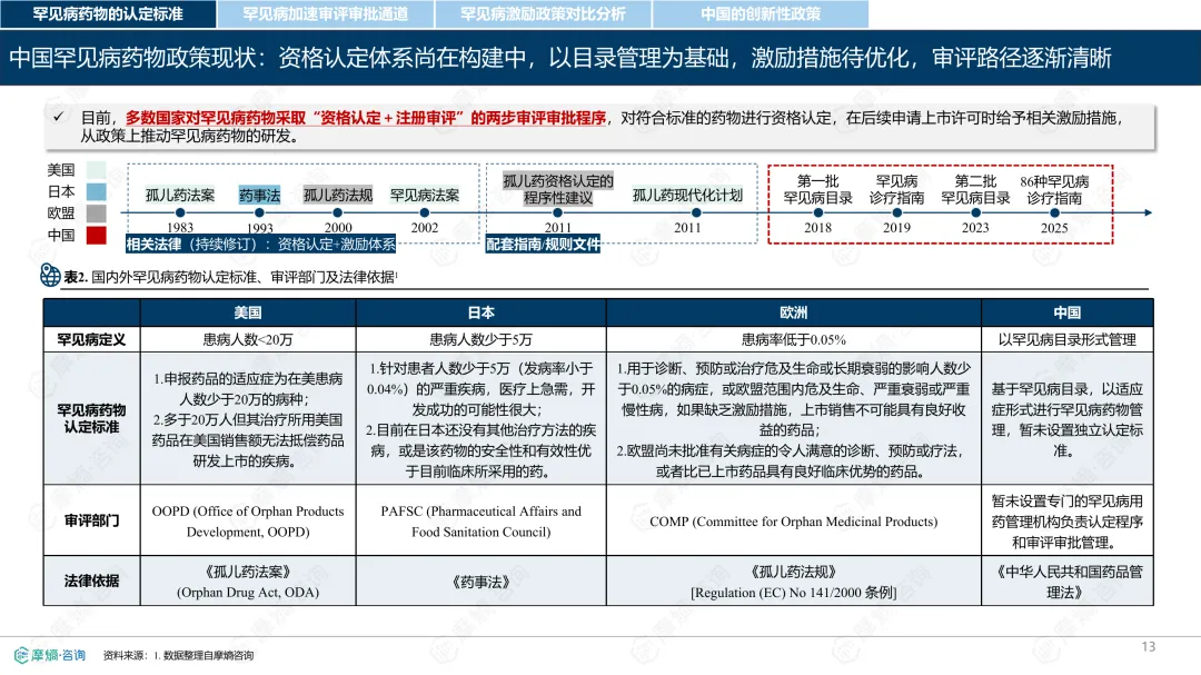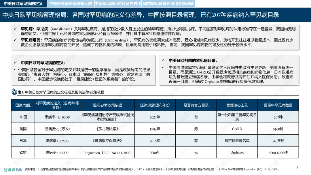罕见病指在极少数人群中发生的疾病,全球已确认的种类接近7000种,其中80%为遗传性疾病。各国对罕见病的定义和管理方式存在差异。中国通过国家罕见病目录进行管理,目前已有207种疾病纳入;美国主要依赖GARD数据库进行信息管理,未设统一目录;日本以“难病”为基础建立名录,强调医保可负担性;欧盟则通过Orphanet数据库进行疾病信息管理,但未设立统一目录。从患者数量看,欧盟受影响人数最多,约3000万;中国超过2000万;美国约2500万;日本根据推算约为440万至740万。中国罕见病患者中,先天性和遗传性疾病占比高,确诊率低且地区间差异明显,登记系统尚在建设中。在药物可及性方面,截至2024年底,中国已有1883种罕见病药物获批上市,覆盖约70.5%的罕见病,但仍有近三成疾病无药可用。美国累计批准8821种罕见病用药,数量远超其他国家;欧盟批准超过2604种;日本暂无官方数据。2024年,中国批准55种罕见病药物,美国26种,欧盟15种,日本22种。中国罕见病用药可及性受限的原因包括:高价药物仍难以负担,多数疾病未纳入医保,本土研发能力虽在提升,但与国际领先企业相比仍有差距。部分药物虽在国内上市,但尚未获批适应症,或境外有药但境内未获批准。罕见病药物开发成本高、受众少,导致市场回报有限,企业投入意愿较低。尽管如此,部分企业仍因患者需求而参与相关研究,表现出一定的人文关怀。