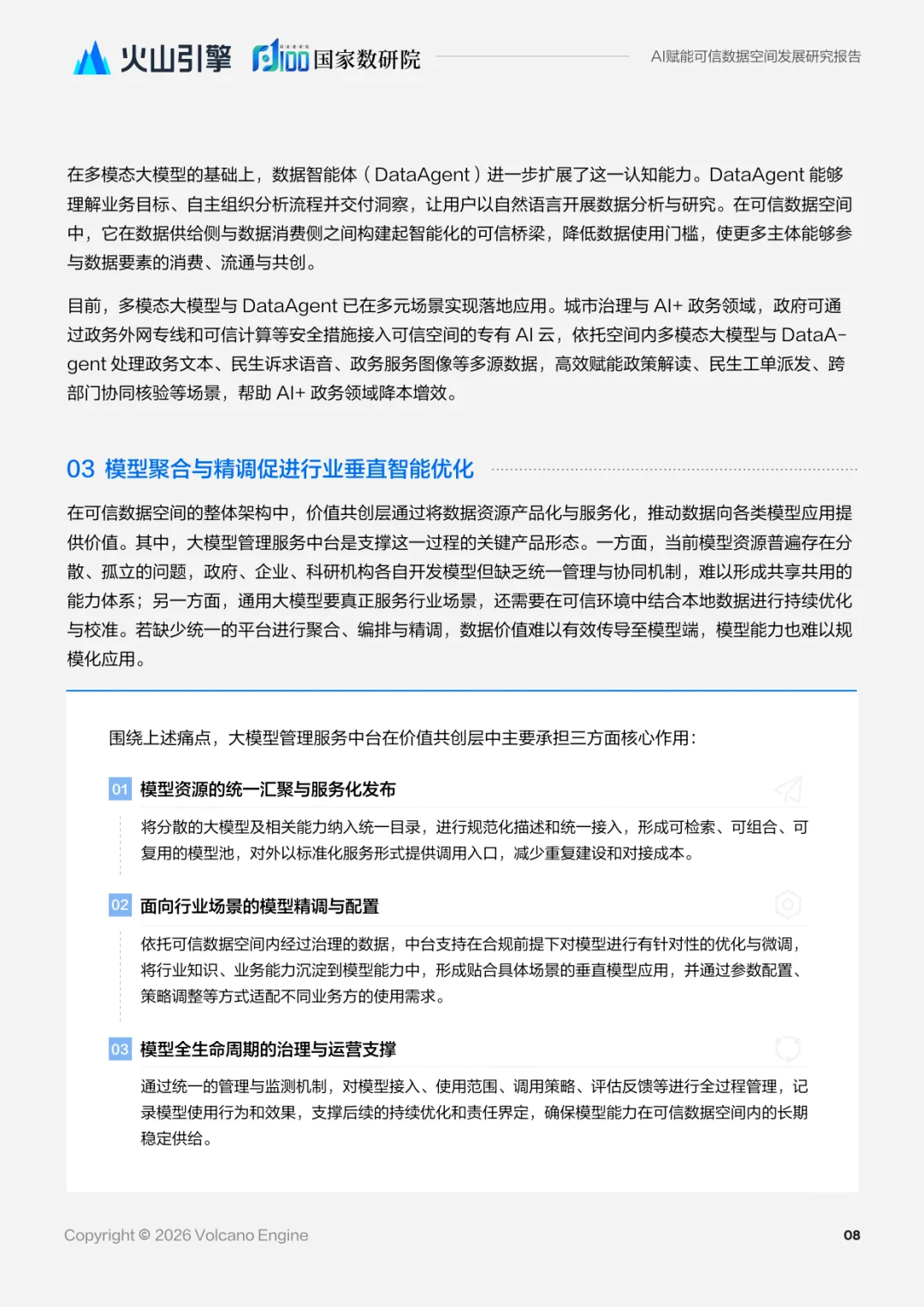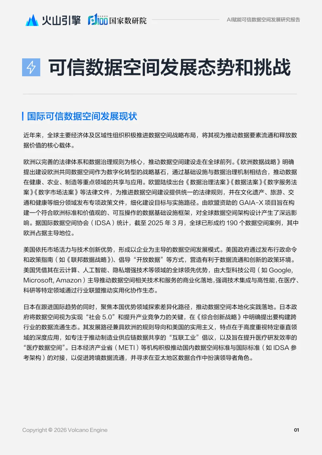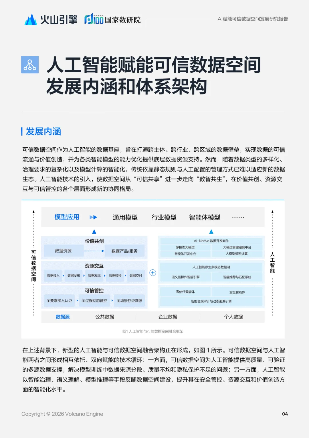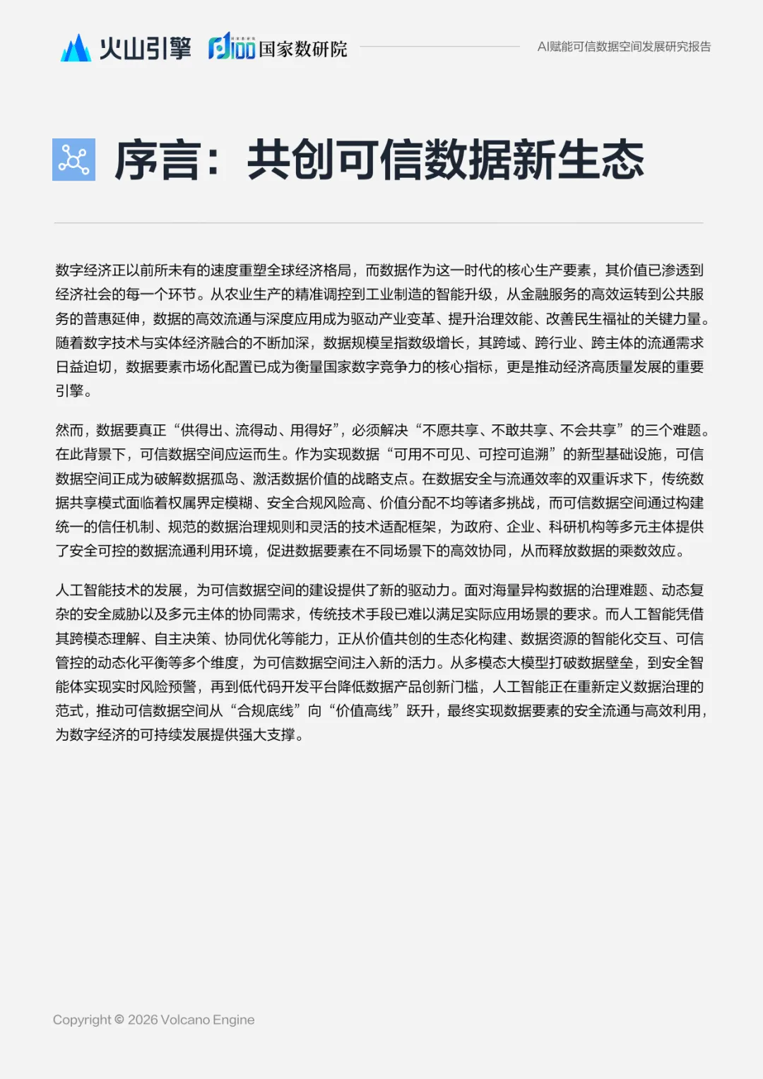 2026 年 1 月编制的这份报告由火山引擎与国家数据发展研究院联合发布,聚焦人工智能对可信数据空间的赋能价值,剖析发展现状、挑战,构建赋能体系并结合实践案例给出发展展望,为破解数据流通难题、释放数据要素价值提供了系统性方案。