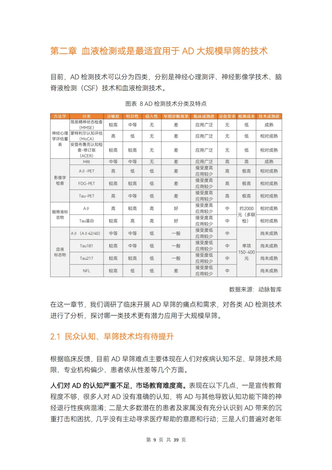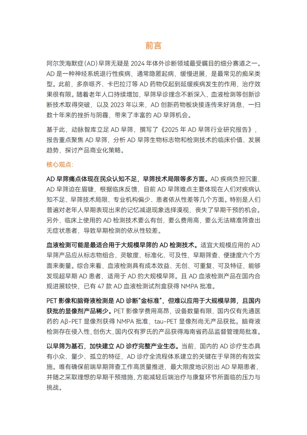 基于此,动脉智库立足 AD 早筛,撰写了《2025 年 AD 早筛行业研究报告》,报告重点聚焦 AD 早筛,分析 AD 早筛生物标志物和检测技术的临床价值、发展趋势,探讨产品商业化策略。