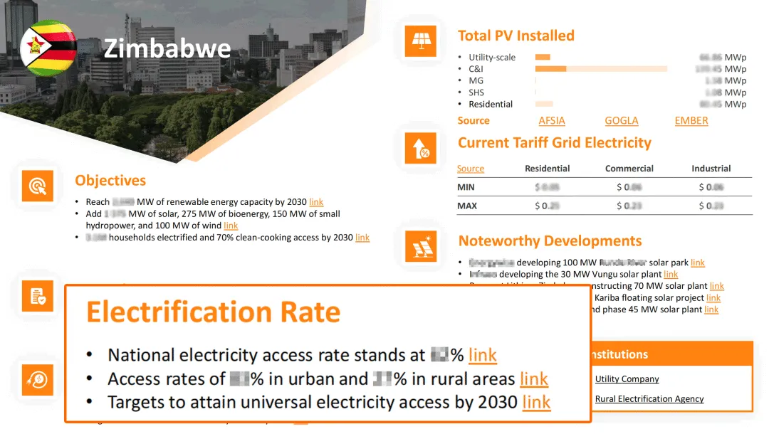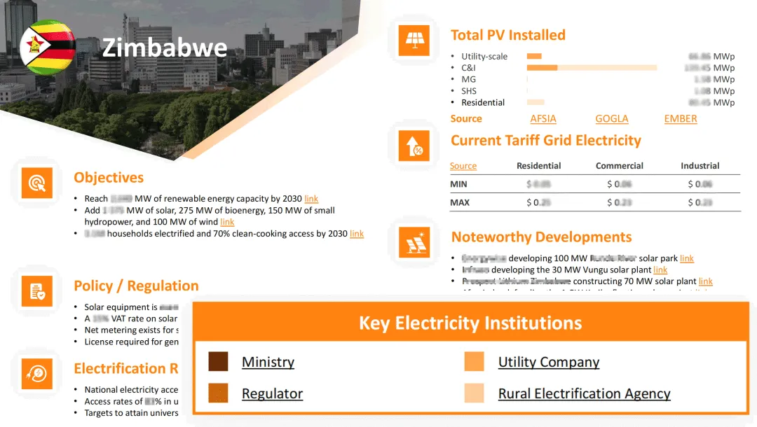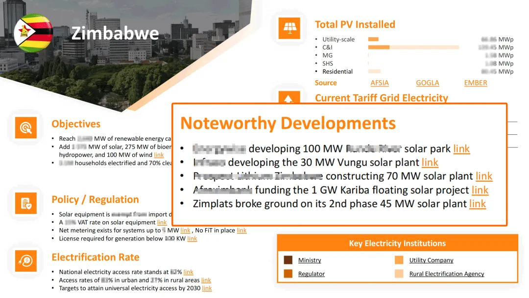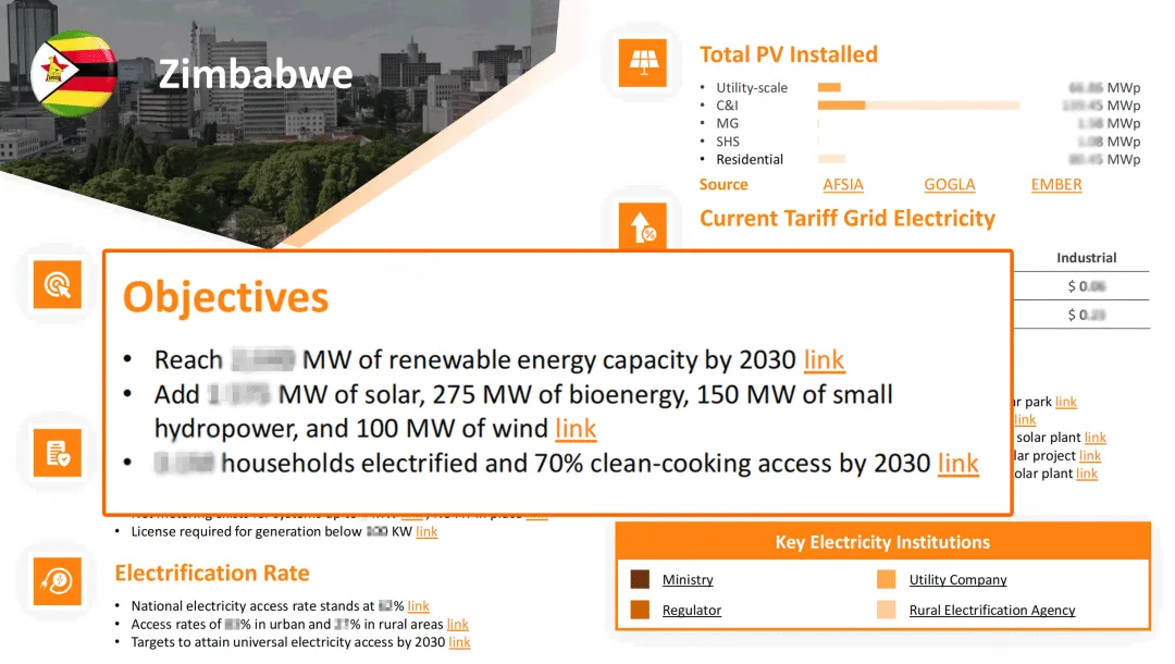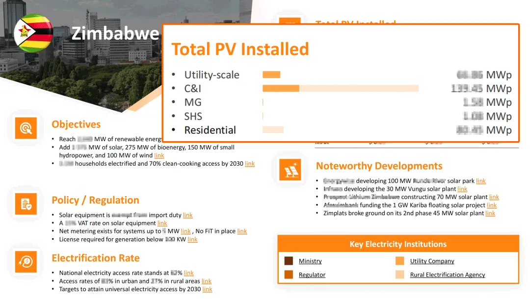 截止 2025 年底,津巴布韦集中式光伏电站、工商业、微电网、小型家庭系统和户用光伏的累计装机量(数据包含来源链接,点击可进一步查看详情)。