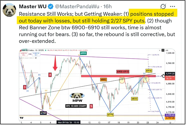 我没有盯盘,因为我正处于“无线电静默”模式 —— 这是一种特殊的交易策略和自控机制,我会强制剥夺自己使用任何电子设备监控市场和修改预设订单的权利 —— 要么我的仓位被逐一止损,要么它们会逐一赢得大捷【当时持有 2/20 到期的 685 SPY看跌期权和2/27到期的680SPY看跌期权】