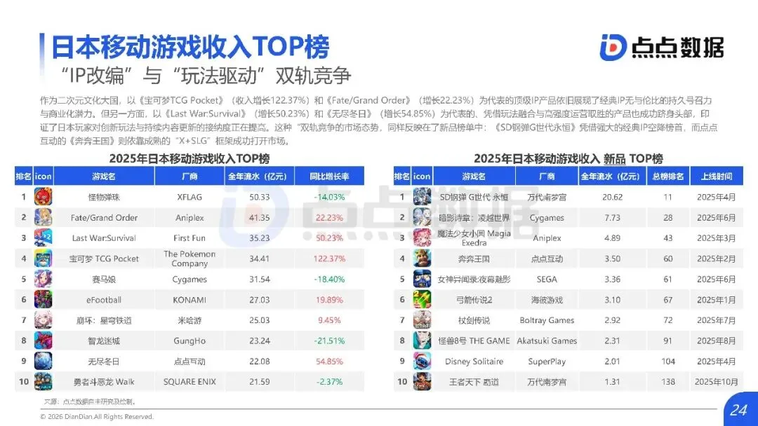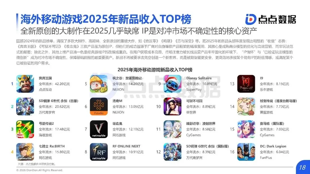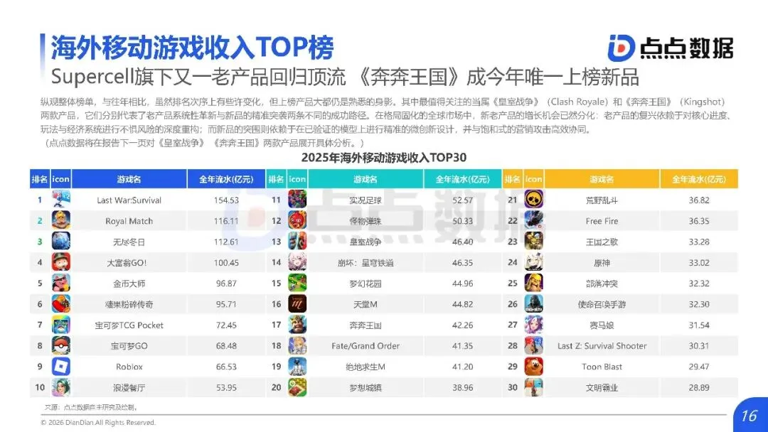 中国厂商在全球市场的存在感也持续提升,不仅在海外收入榜单中占据多个席位,更打造出《无尽冬日》《奔奔王国》等全球爆款产品。