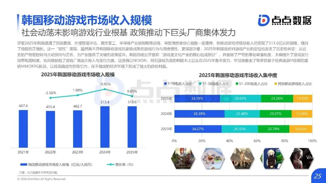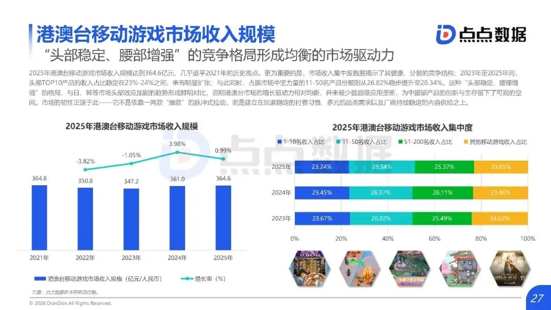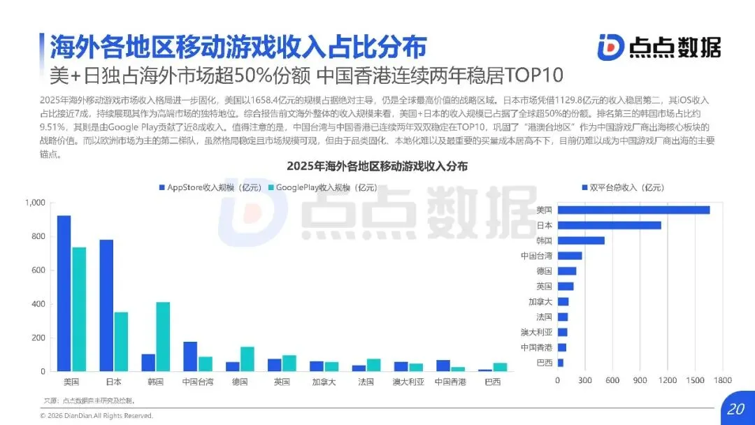 中国市场则以2859.2亿元的收入规模录得 0.56% 的微弱增长,正式进入存量平台期,港澳台地区则持续成为中国厂商出海的核心板块,2025 年收入规模达 364.6 亿元,几乎追平历史高点。