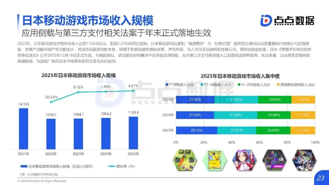 其中,美日两大市场成了海外的核心增长极,二者合计占据海外移动游戏市场超 50% 的份额,美国以 1658.4 亿元的收入规模稳居第一,日本则凭借 1129.8 亿元的收入实现 4.21% 的同比增长,成为高端市场的代表。