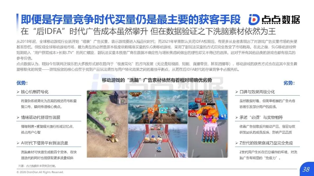 即便身处存量竞争,买量依旧是全球移动游戏行业最主要的获客手段。后 IDFA 时代广告成本虽持续攀升,但洗脑中的素材依旧占据着获客优势,厂商们开始更注重找到产品玩法与用户转化的平衡点,将复杂的游戏机制简化为直观的视觉符号,用情绪驱动抢占用户心智。