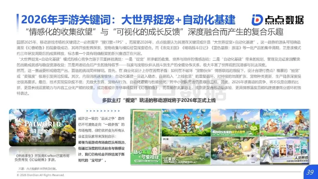 产品设计上,行业也迎来了新的趋势,2026 年手游的核心关键词锁定大世界捉宠 + 自动化基建,这种模式将收集的情感联结与基建的成长反馈深度融合,满足玩家的多重体验需求。