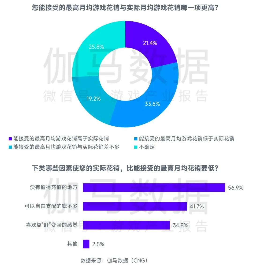用户付费能力仍有可提升空间。从调研结果来看,21.4%用户的实际付费低于可接受的付费上限,而二者差值的原因主要受用户对付费内容认同的影响,其中56.9%的用户认为没有值得充值的地方。